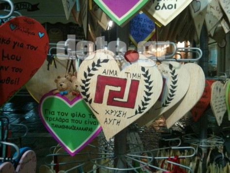Η... τελευταία μόδα είναι μπρελόκ τύπου "i love you" σε σχήμα καρδιάς με το σήμα της Χρυσής Αυγής. Σύμφωνα με το dete.gr, το γεγονός έχει σχολιαστεί αρνητικά από αρκετούς κατοίκους της μαρτυρικής πόλης, που εμφανίζονται ενοχλημένοι...ΞΥΔΙ ΞΥΔΙ ΞΥΔΙ ΞΥΔΙ ΞΥΔΙ ΞΥΔΙ!!!!!!